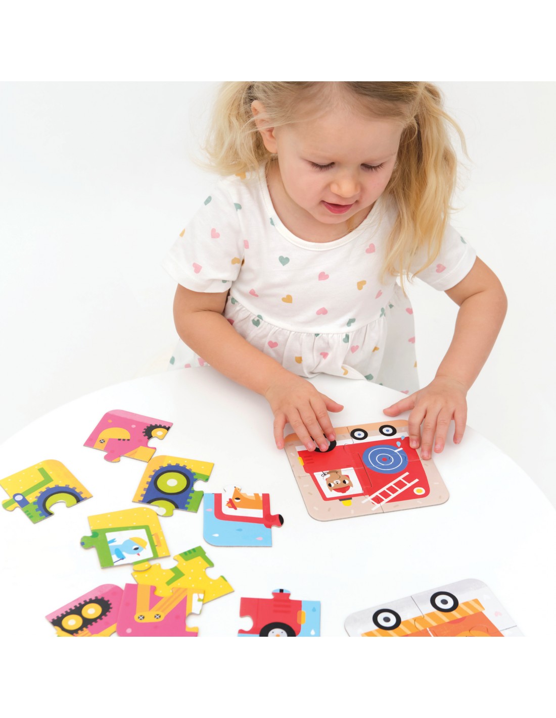 This handy box contains 5 puzzles, each with 4 pieces. Colorful pictures encourage children to assemble the puzzle, which is the most perfect way to develop manual dexterity and dexterity. Puzzles inspire children to learn the names of new animals, vehicles and colors, new sounds, as well as new physical toys – let your imagination run wild! Young big vehicle enthusiasts will love assembling these vehicles as a first multi-piece puzzle.
