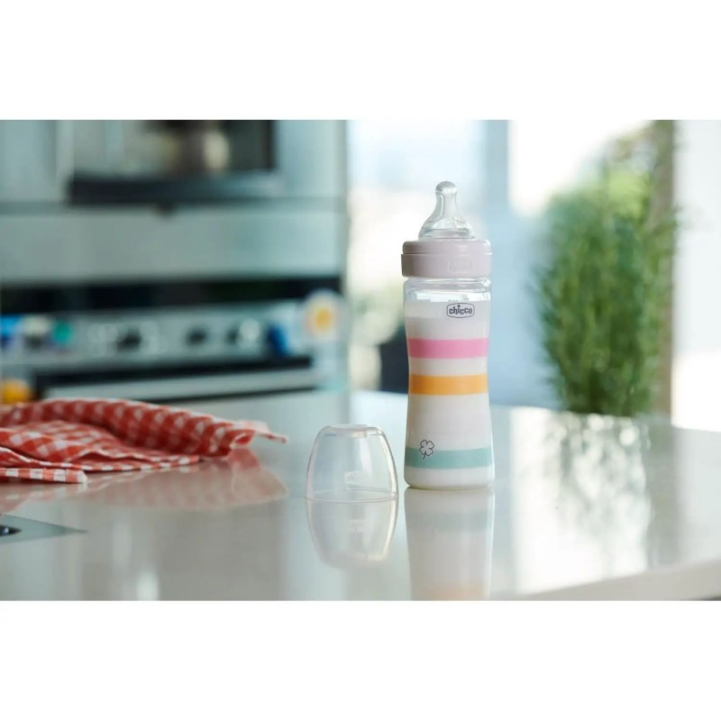 The Chicco Well-Being 250ml plastic bottle guarantees maximum practicality thanks to its ergonomic shape, is suitable for sterilization and is dishwasher safe.