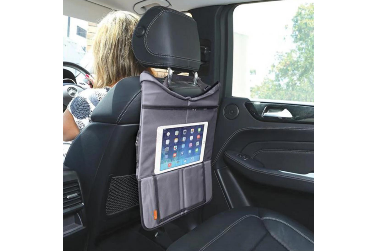 It has two tablet pockets and one storage pocket with an adjustable strap