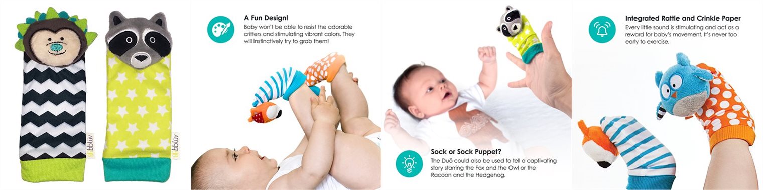 Guaranteed fun from top to toe with these cute little socks. The bblüv Foot Finders help and stimulate the development of baby’s fine mobility. You can also use them as puppets with your hands.