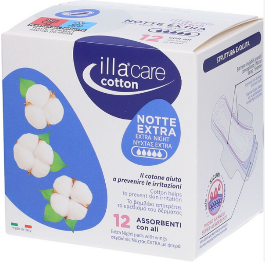 Illa Care Extra Night, Night Sanitary Napkins, made of 100% hydrophilic cotton to protect against irritation and ensure very high absorbency, 12pcs