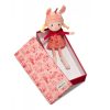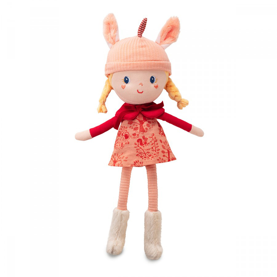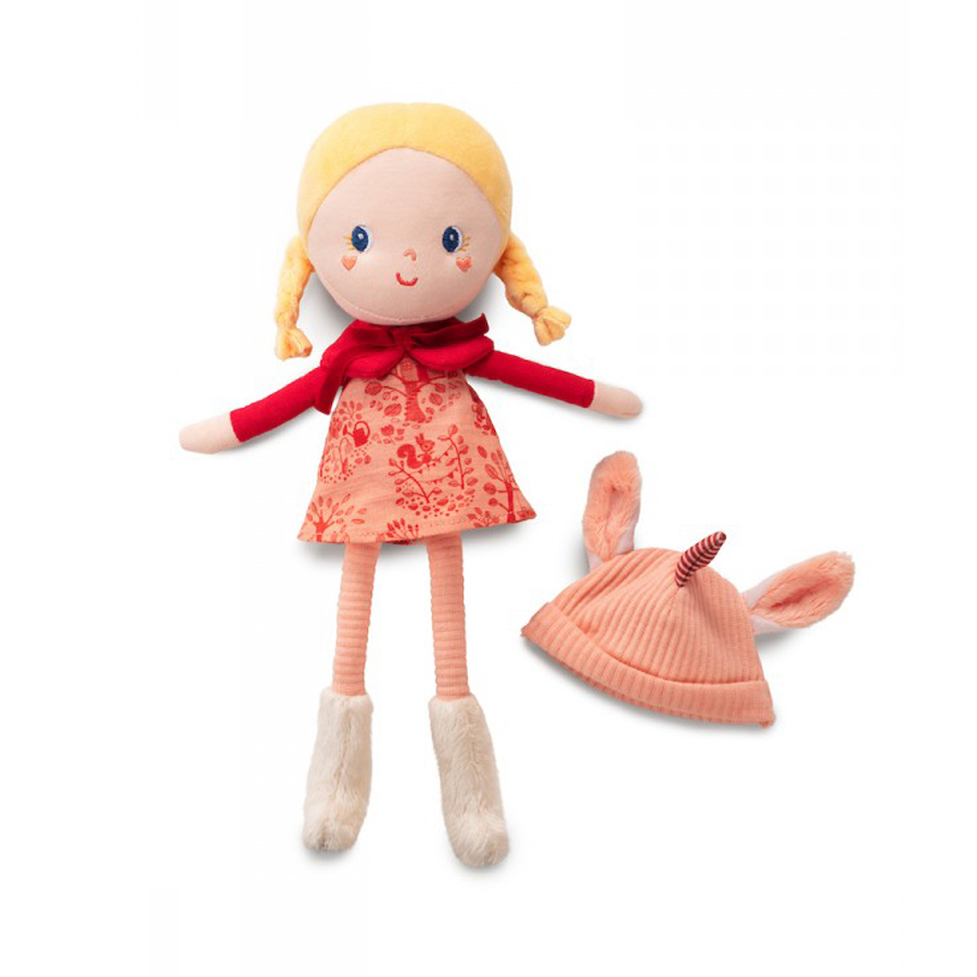 Soft doll with red-salmon shades in clothes from the Lilliputiens company.