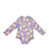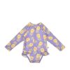 The one-piece children’s swimsuit with sleeves and sun protection from Zoocchini, in purple with yellow details, combines style and protection for little explorers.