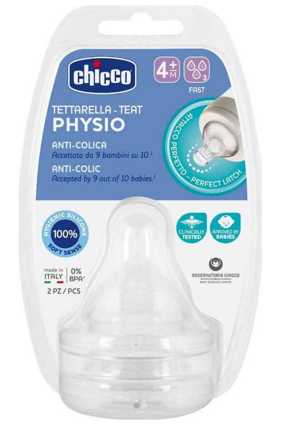Η θηλή σιλικόνης Physio Chicco προσαρμόζεται τέλεια στο στόμα του μωρού και σέβεται τη φυσική κίνηση θηλασμού. Κατασκευασμένο από εξαιρετικά μαλακή σιλικόνη, η θηλή Chicco Physio προσομοιώνει τέλεια το στήθος της μητέρας, προσφέροντας στο μωρό μια άνετη αίσθηση που διευκολύνει την αποδοχή. Χάρη στο εργονομικό της σχήμα, η θηλή Physio Silicone της Chicco ευνοεί την ρυθμική κίνηση της γλώσσας κατά τη διάρκεια του πιπιλίσματος. Διαθέσιμο σε 4 διαφορετικές παραλλαγές ροής, η θηλή Physio προσαρμόζεται τέλεια σε όλα τα μπουκάλια των σειρών PERFECT 5, Well-Being και Original Touch.