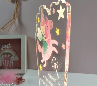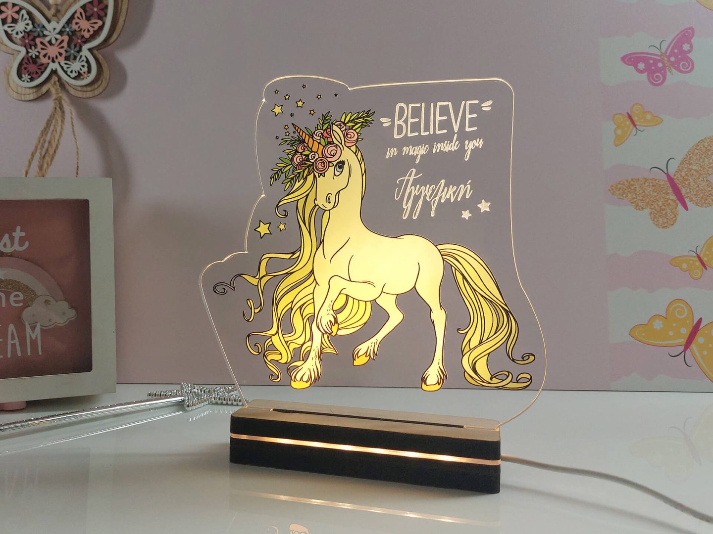 • Υλικά: Led λευκού χρώματος, Ακρυλικό διάφανο πάχους 6mm, Χειροποίητη βάση από ξύλο και ακρυλικό