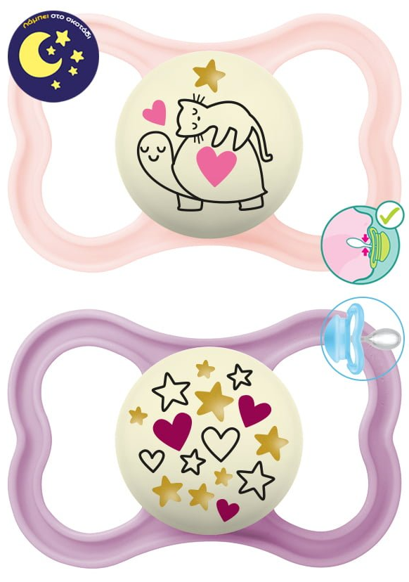 Αεράτος minimal σχεδιασμός της ασπίδας για λιγότερους ερεθισμούς. Η πιπίλα Air Night, που λάμπει στο σκοτάδι, σε συνδυασμό με την τέλεια θηλή της πιπίλας Perfect!