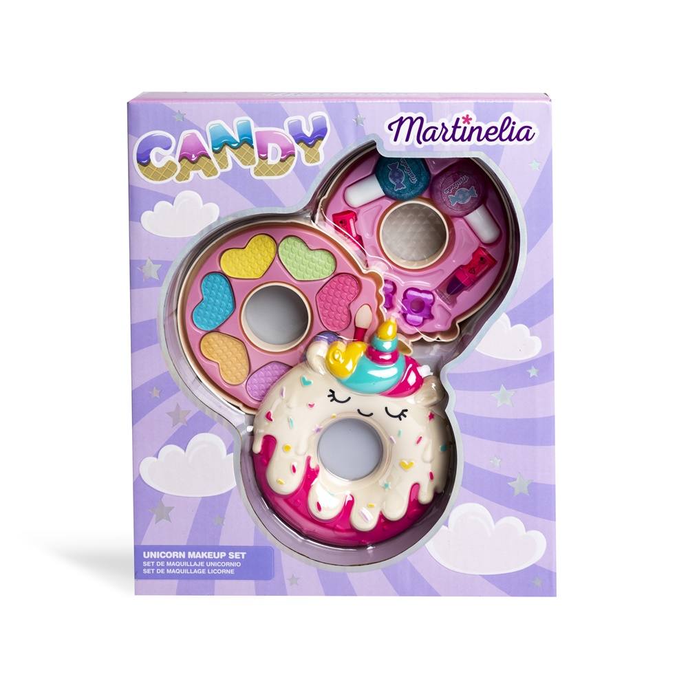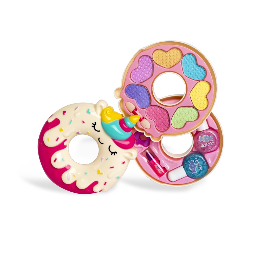 Ενθουσιάστε τις μικρές σας πριγκίπισσες με το Candy The Sweetest Unicorn Makeup Set – μια παιδική multi παλέτα 2 επιπέδων σε σχήμα donut που περιλαμβάνει 7 διαφορετικά χρώματα σκιών σε compact μορφή, 2 υδατοδιαλυτά βερνίκια νυχιών, 2 lipstick, 2 κοκαλάκια μαλλιών και ένα πινελάκι.