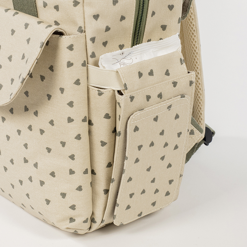 Η Walking Mum μας φέρνει ένα σακίδιο πλάτης από την σειρά Poppy σε εκρού χρώμα με λαδί καρδούλες, ιδανική για να μεταφέρετε τα πράγματά σας και του μωρού σας, με υπέροχο στυλ, σε όλες τις βόλτες σας.