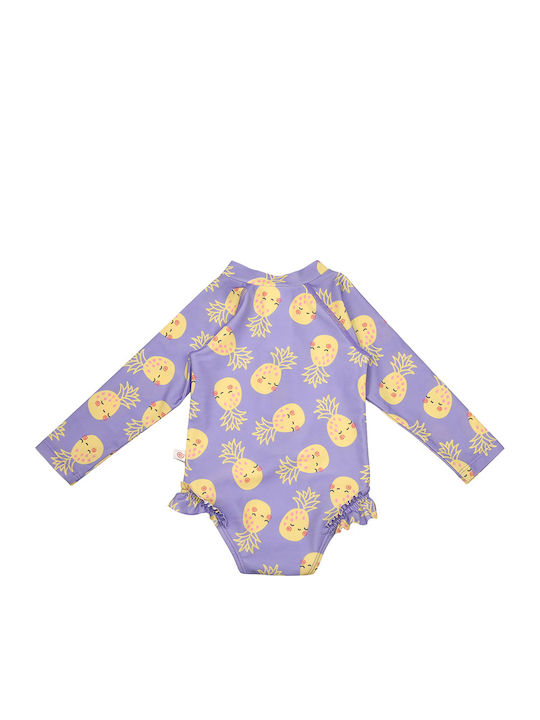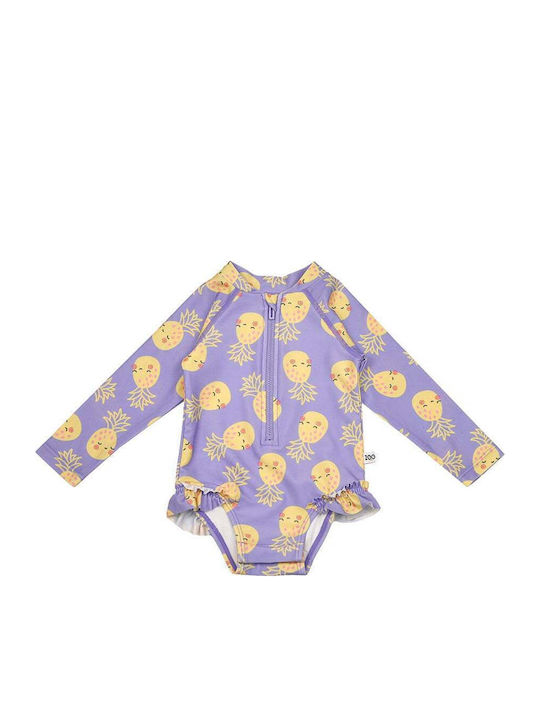 Το ολόσωμο παιδικό μαγιό με μανίκια και αντηλιακή προστασία από την εταιρεία Zoocchini, σε μωβ χρώμα με κίτρινες λεπτομέρειες, συνδυάζει στυλ και προστασία για μικρούς εξερευνητές.